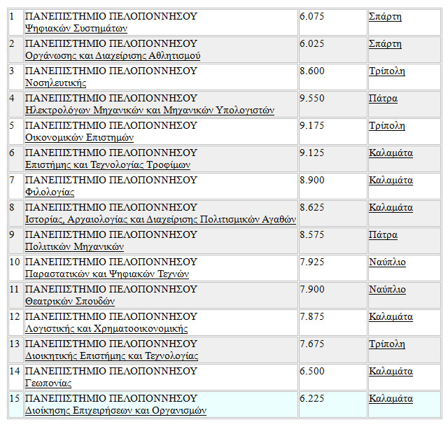 Ειδικά στο Πανεπιστήμιο Πελοποννήσου, μόνο σε 7 Τμήματα η Βάση Εισαγωγής από τα Γενικά Λύκεια ήταν πάνω από τις 10.000 μονάδες, ενώ για τα παρακάτω 15 η Βάση ήταν κάτω από τις 10.000 μονάδες: