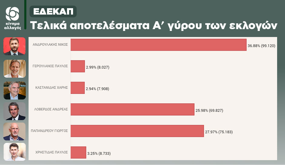 Με ενσωματωμένο το 100% των ψήφων, ο Νίκος Ανδρουλάκης συγκέντρωσε ποσοστό 36,88% και έχει διαφορά 8,91% από τον δεύτερο Γιώργο Παπανδρέου, με τον οποίο θα αναμετρηθεί την ερχόμενη Κυριακή, 12/12.