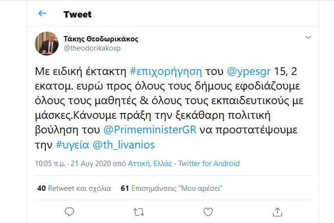 Λίγη ώρα αργότερα ο κ.Θεοδωρικάκος έκανε μία ανάρτηση στο twitter και ανέφερε πως θα δοθεί στους δήμους ειδική έκτακτη επιχορήγηση 15,2 εκατομ. ευρώ.