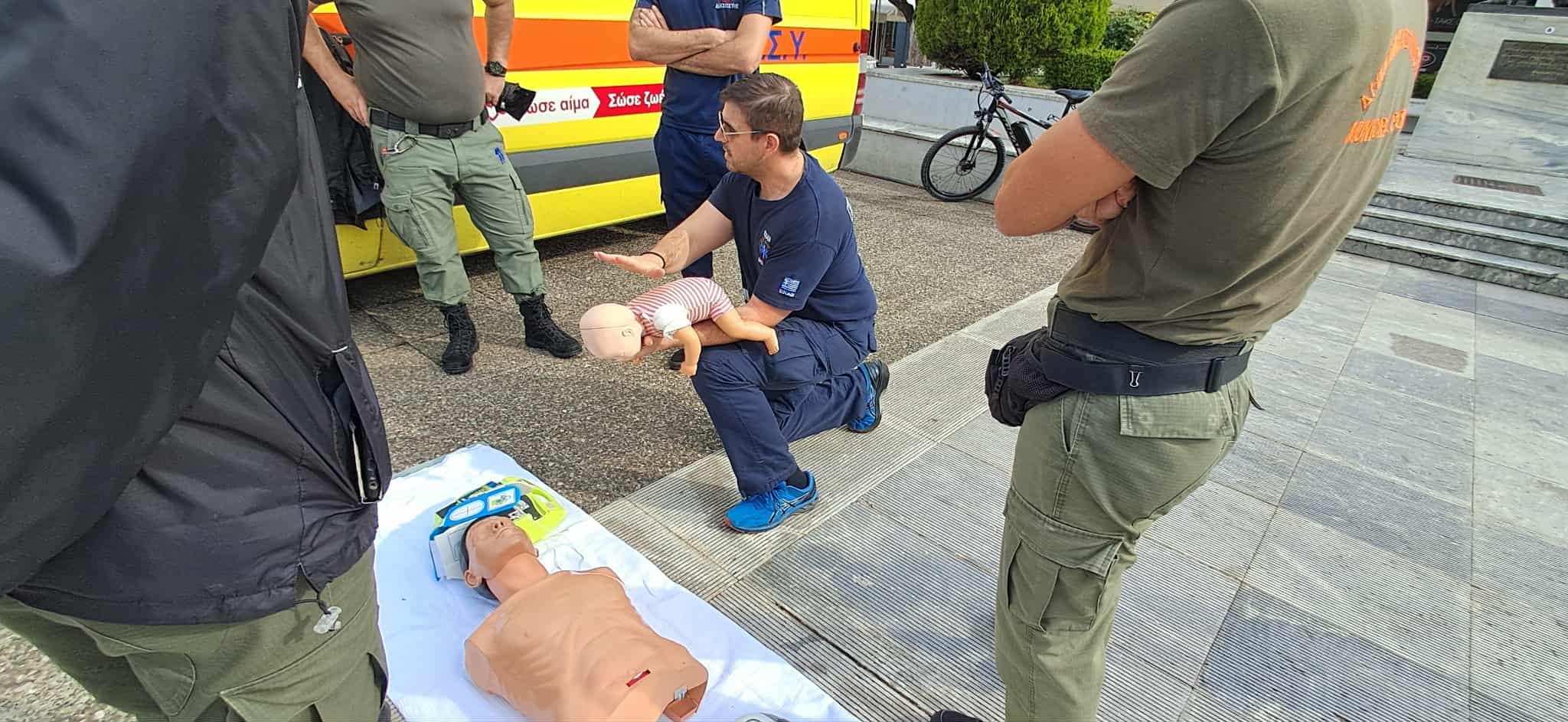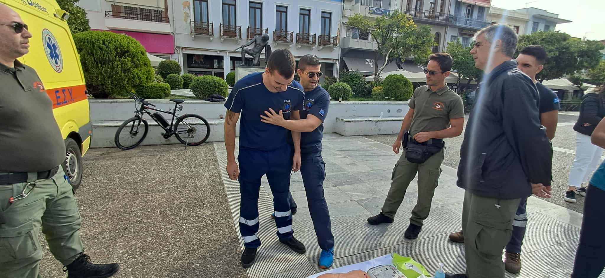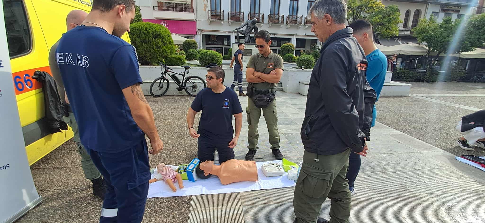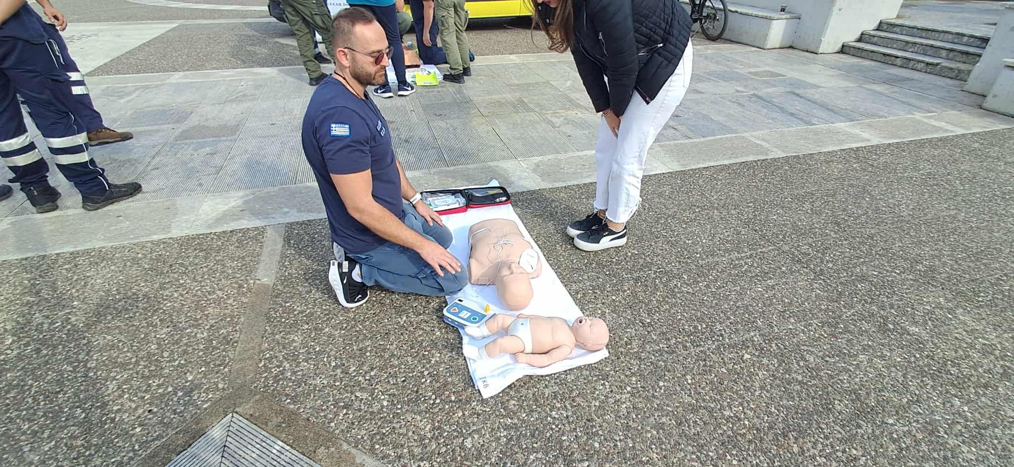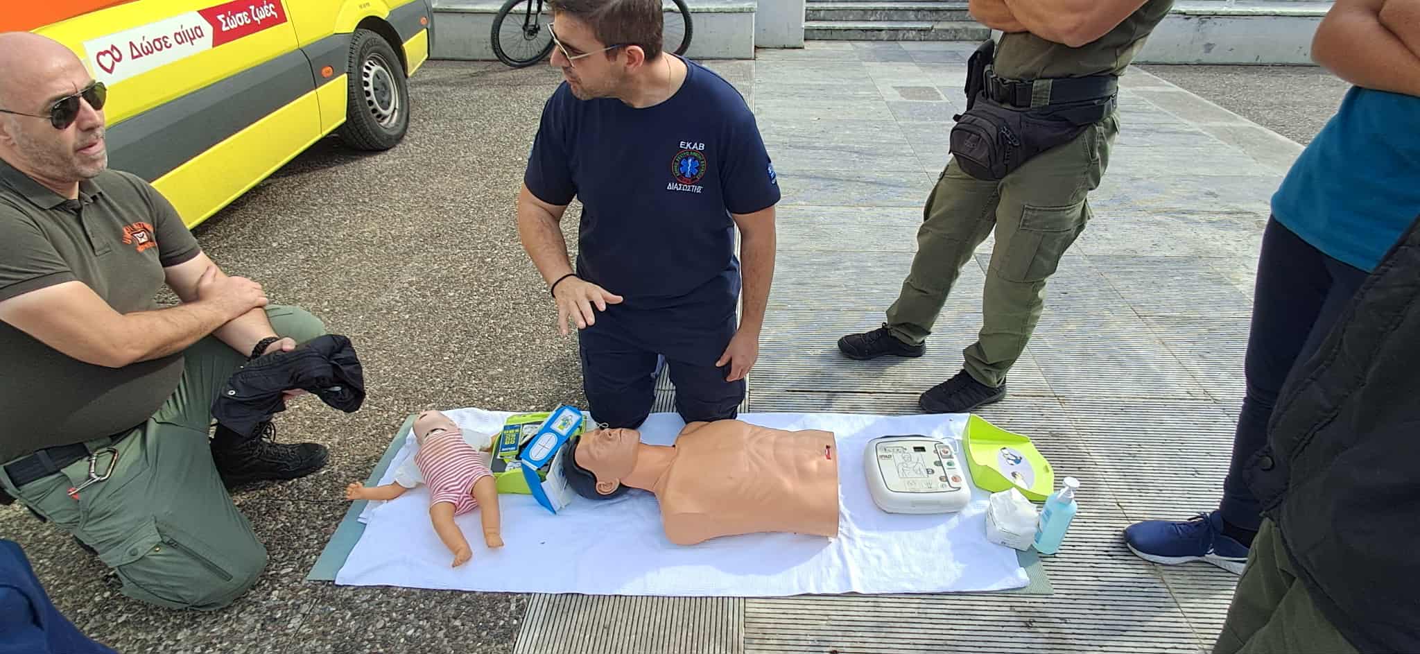Διασώστες, νοσηλευτές και ιατροί του ΕΚΑΒ έκαναν επίδειξη στην Καρδιοπνευμονική Αναζωογόνηση (ΚΑΡΠΑ) αλλά και στη χρήση του Αυτόματου Εξωτερικού Απινιδωτή (CPR/AED), για την υποστήριξη της καρδιακής λειτουργίας και την επιβίωση των θυμάτων καρδιακής ανακοπής, κάνοντας χρήση προπλασμάτων και εκπαιδευτικών απινιδωτών.